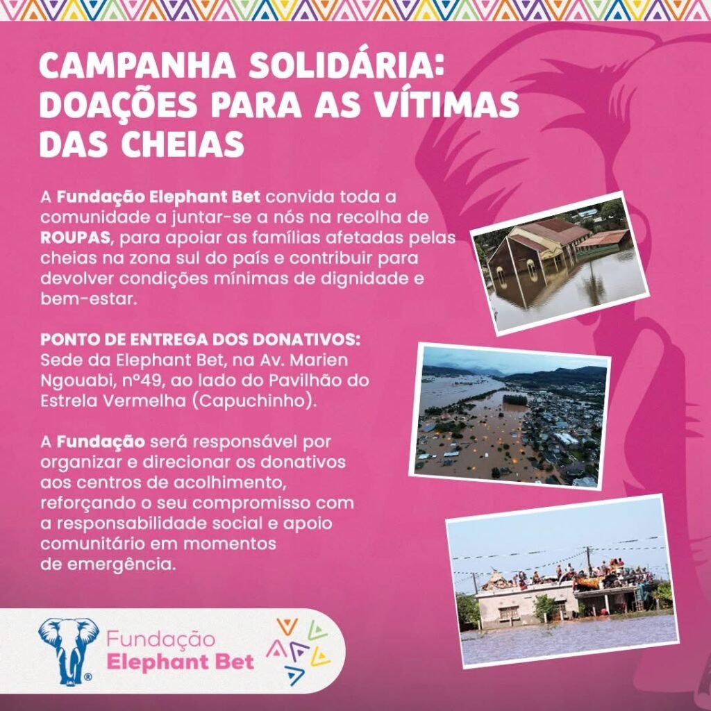 Fundação Elephant Bet iniciou uma campanha solidária de recolha de roupas destinada a apoiar famílias afetadas pelas cheias que têm assolado várias províncias do sul de Moçambique. A iniciativa visa proporcionar condições mínimas de dignidade e bem-estar às populações que perderam habitação e bens essenciais devido às inundações.