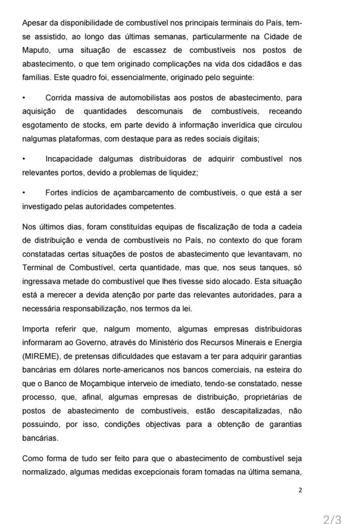 O Executivo refere ainda que algumas distribuidoras alegaram dificuldades na obtenção de garantias bancárias em dólares. No entanto, após intervenção do Banco de Moçambique, foi constatado que algumas empresas se encontram descapitalizadas, sem condições reais para aceder a esses mecanismos financeiros.