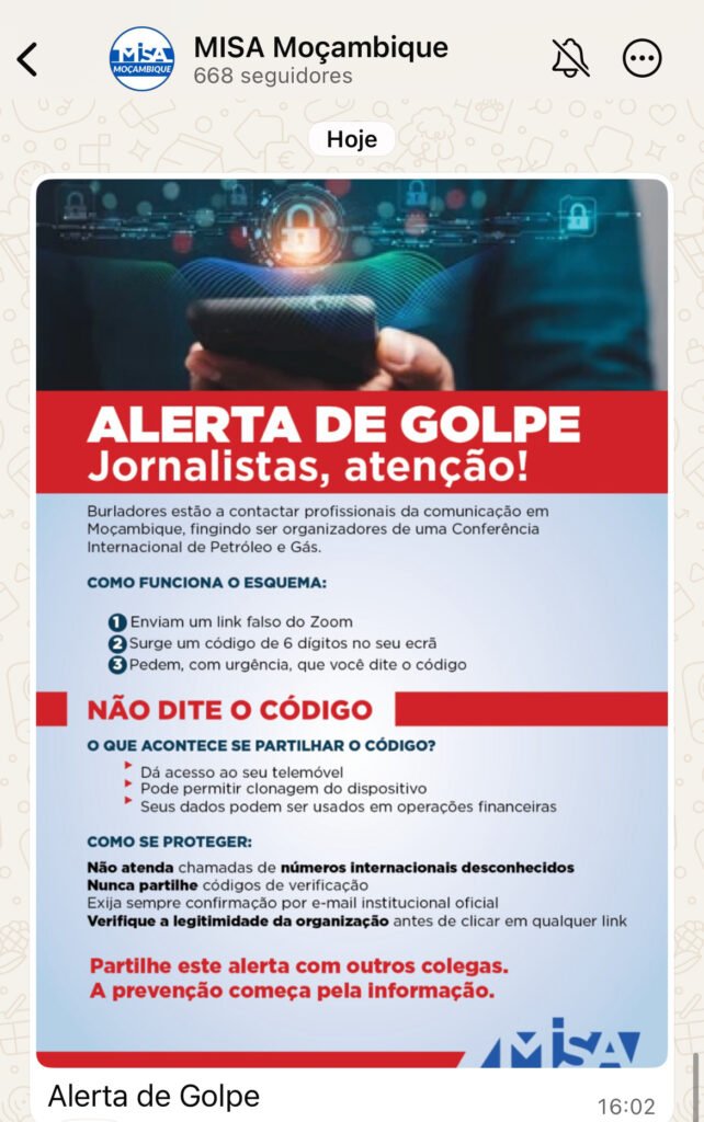 A MISA Moçambique emitiu um alerta público sobre um novo esquema de burla que está a atingir profissionais da comunicação social em Moçambique, envolvendo o uso de plataformas digitais e técnicas de engenharia social para roubo de dados.