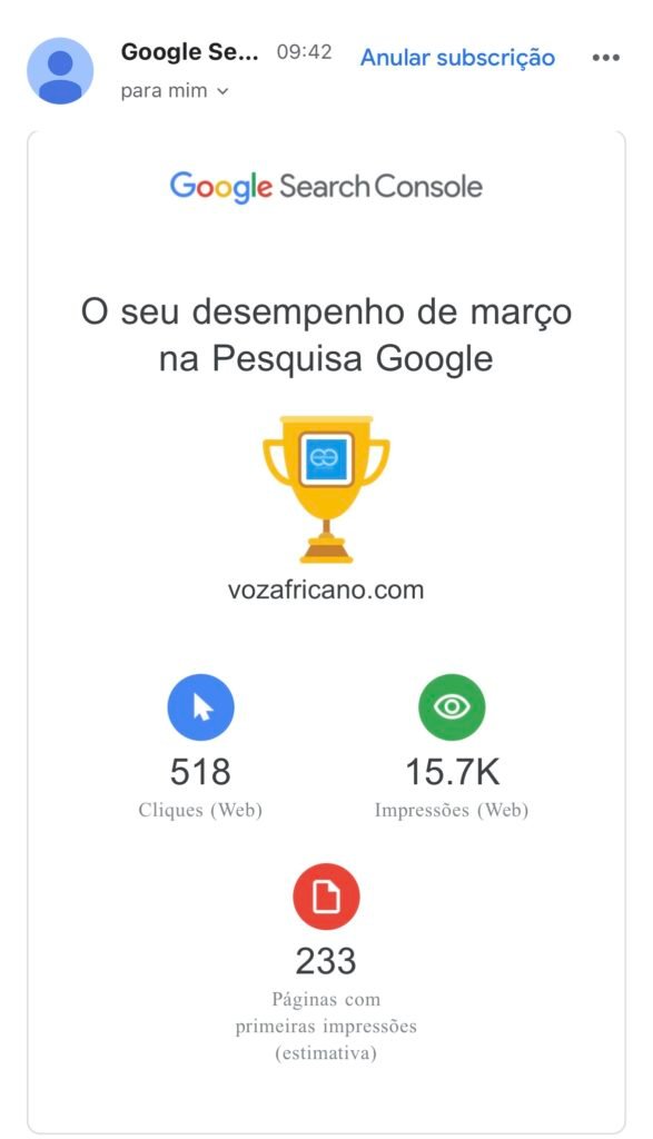 O portal de notícias VozAfricano.com registou um crescimento significativo na sua presença digital, ao alcançar 15,7 mil impressões na Pesquisa Google durante o mês de Março, mesmo contando com apenas cinco meses de existência.