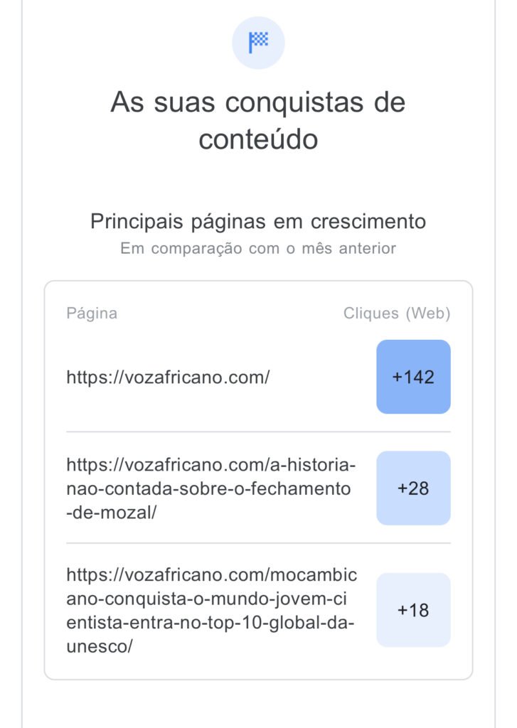 Segundo o relatório, além das 15.7 mil impressões, o VozAfricano registou 518 cliques, o que significa que centenas de leitores acederam directamente ao portal através de pesquisas feitas no Google, demonstrando o aumento gradual da confiança do público e do interesse pelos conteúdos publicados.